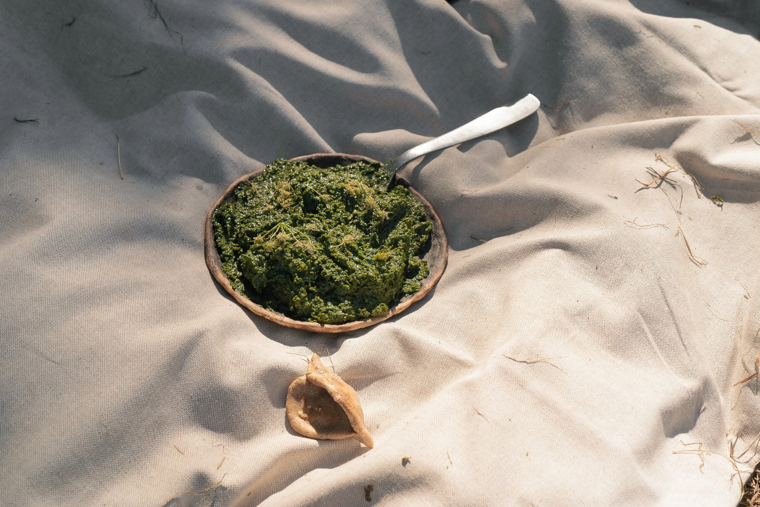 The workshop concluded with the display of several experiments on a picnic blanket, which was realised by Inês Coelho da Silva. The menu included four types of landscape cold teas, grape leaf and vine infused milk (with a paring of soapwort foam), bread cutlery sculptures, Persian pebble bread, fig leaves butter, wild angelica polenta cake, ‘friendship pesto’ (nettle and plantago with pistachio), magical starlight salt, leaks cooked on open fire, a refreshing lavender hydrosol (or, as we called it, hydro-soil), dandelion honey and dandelion root coffee. Participants also displayed recipes, ideas, and foraging notes in notebooks, the cover of which was a portable textile tablecloth dyed with foraged plants. - Kevin Bellò